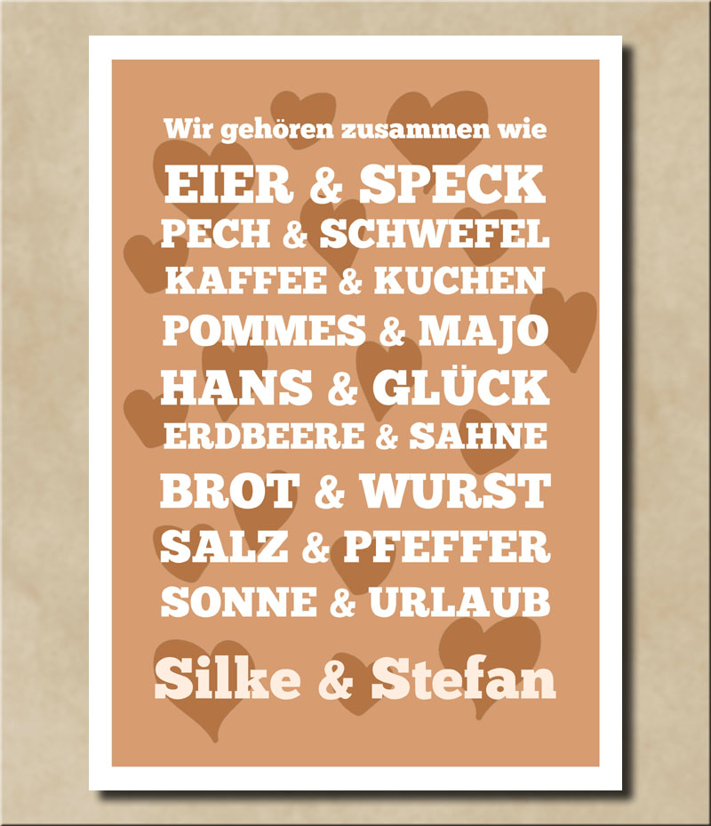 Zeigen Sie mit diesem tollen Bild, dass Sie und ihr/e Partner/in für immer zusammen gehören. Ein wirklich beeindruckendes Geschenk zur Hochzeit, zum Jahrestag, zur Jubiläumshochzeit, zum Valentinstag oder einfach nur so als Zeichen der Liebe.